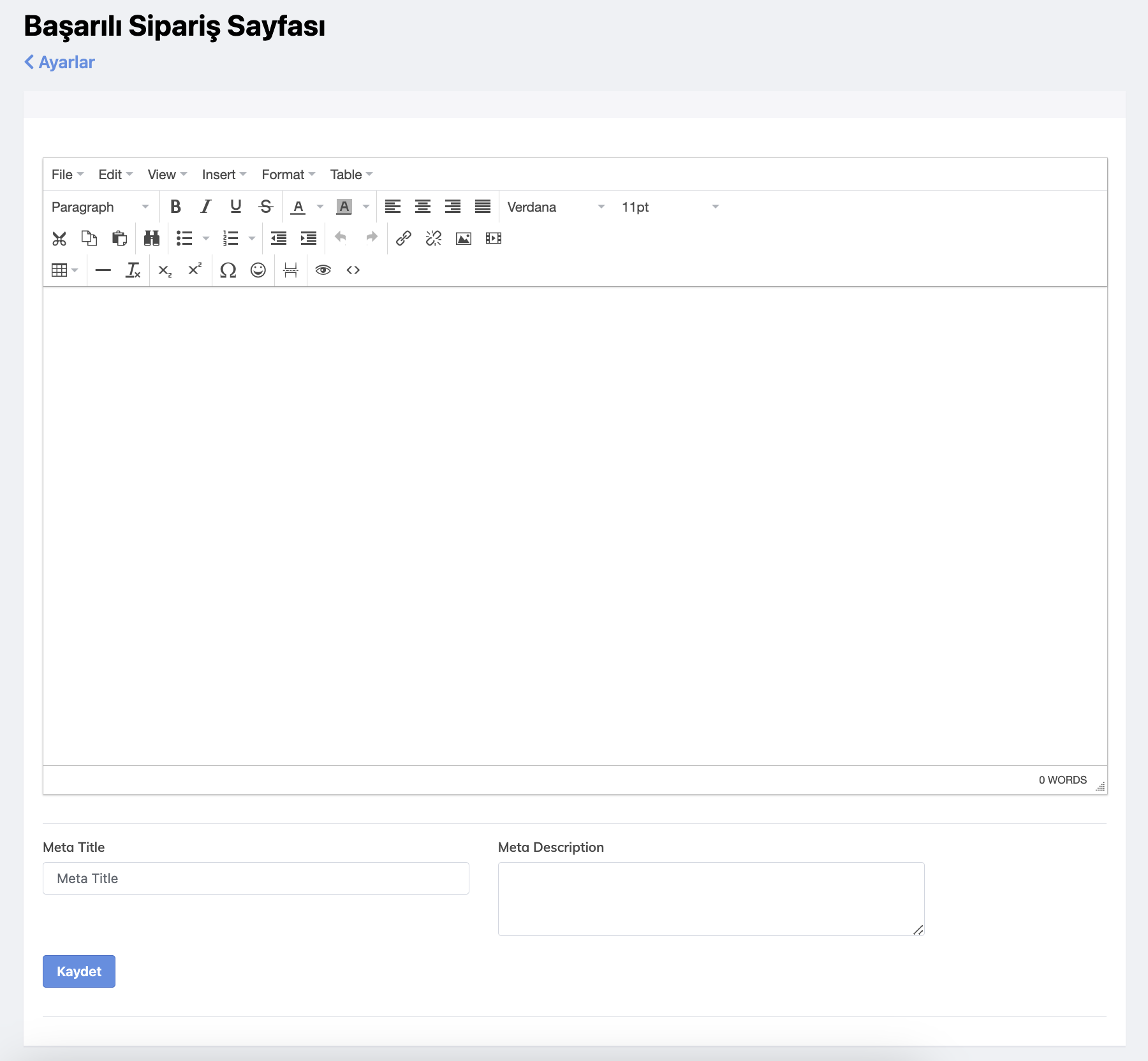 Panelde Ayarlar > Başarılı sipariş Metni gelelim. Bu sayfada çıkmasını istediğimiz yazıyı yazalım.