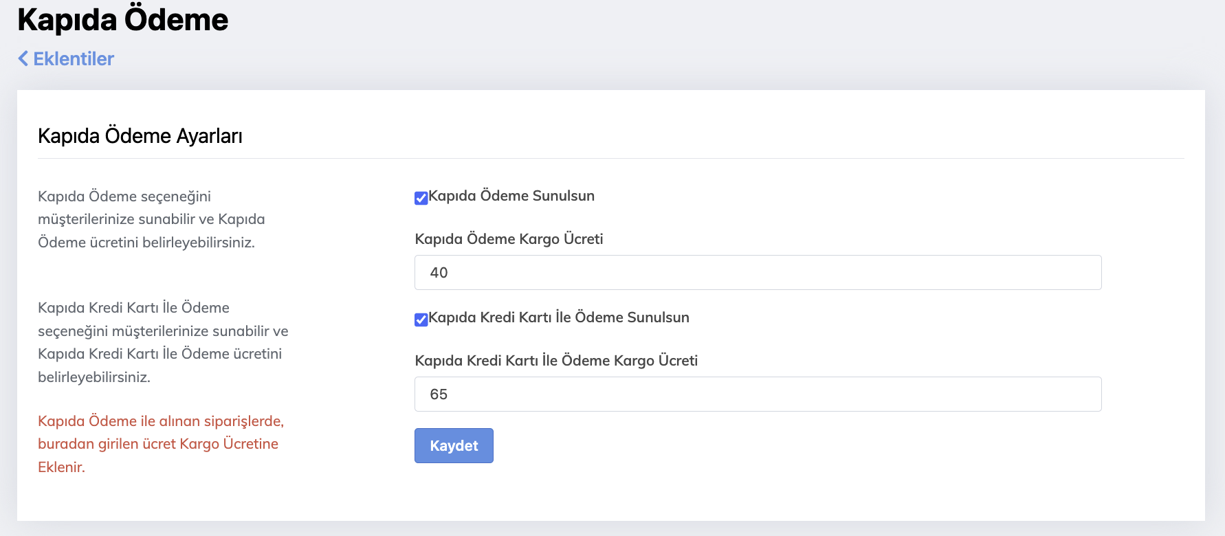 Kapıda Kredi Kartı ile Ödeme Sunulsun başlığı yanındaki check box'u seçelim.