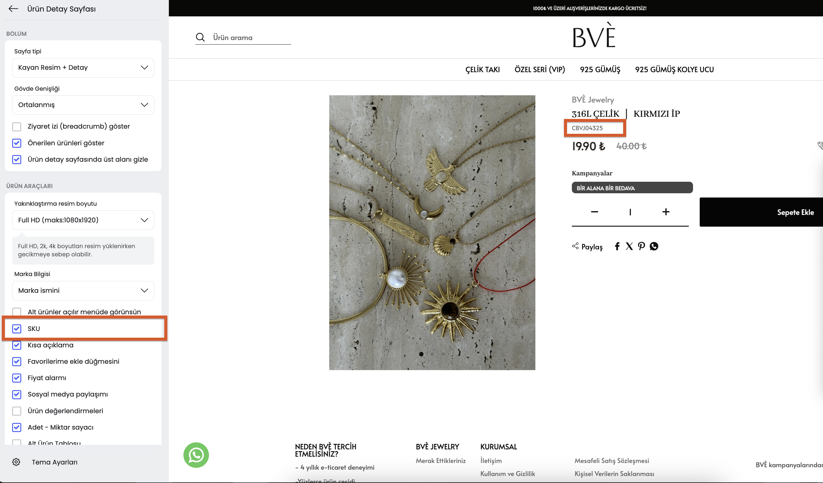 Kaldırmak için Tasarım Editörü > Düzenle > Ürün Detay Sayfası > Ürün Araçları bölümünden SKU tikini kaldırdığınızda görünmeyecektir.