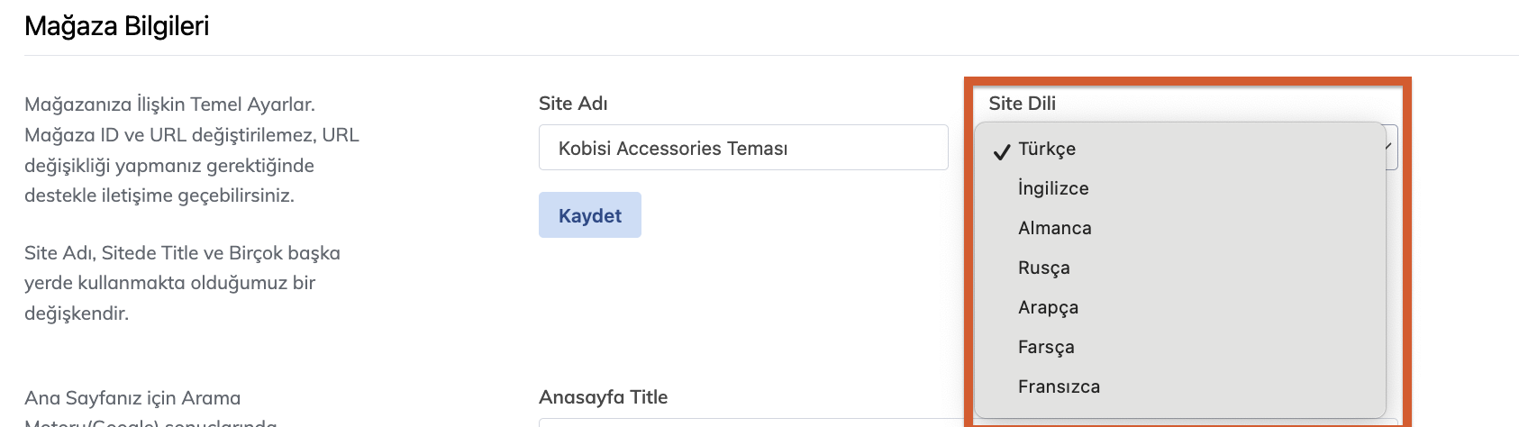 Sitenizin dilini Türkçe olarak kullanmak istiyorsanız Site Dili başlığı altındaki bölümden Türkçe'yi seçelim, Sitenizin dilini İngilizce olarak kullanmak istiyorsanız Site Dili başlığı altındaki bölümden İngilizce'yi seçelim.